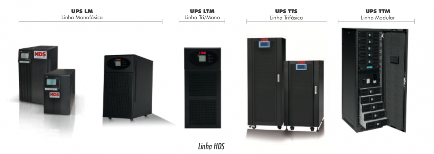 Ale?m de Monofa?sicos e Trifa?sicos a HDS fornece UPS Tri/Mono (entrada trifa?sica, sai?da monofa?sica) destinado a protec?a?o de equipamentos monofa?sicos em redes trifa?sicas.